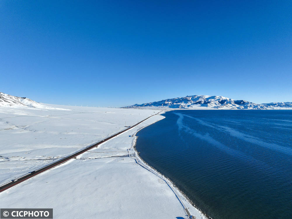 ↑2025年11月8日在位于新疆博尔塔拉蒙古自治州的赛里木湖景区拍摄的景色。(无人机照片)CICPHOTO/何华文 摄
