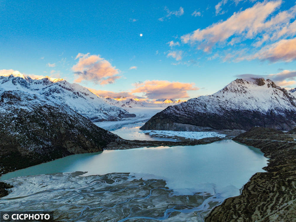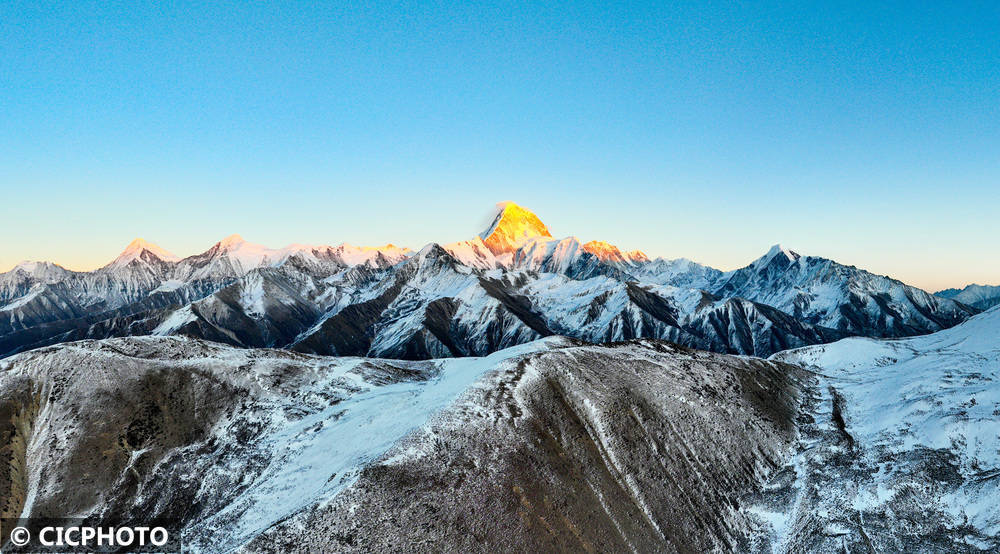 ↑2025年11月24日傍晚,在四川省甘孜藏族自治州,贡嘎雪山呈现“日照金山”景观。(无人机照片)CICPHOTO/黎豪图 摄