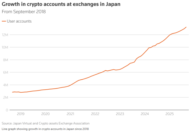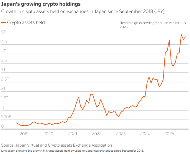 截至7月末,日本投资者持有的加密货币资产规模突破5万亿日元(约合331.6亿美元),较一个月前大幅增长25%,这一数据捕获的正是市场冲顶前后的狂热期;同期以日元计价的比特币(投资者核心持仓品种)价格仅上涨15%。截至9月末,该资产规模小幅回落至4.9万亿日元,已初步反映了市场降温的影响。。